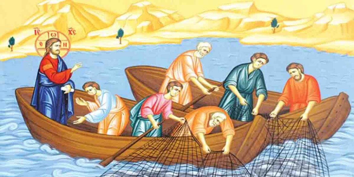 Και ο Κύριος λέγει στον Πέτρο, στον Σίμωνα: «Μὴ φοβοῦ· ἀπὸ τοῦ νῦν (:Από τώρα και εμπρός) ἀνθρώπους ἔσῃ ζωγρῶν(:ανθρώπους θα ψαρεύεις).Καὶ καταγαγόντες τὰ πλοῖα ἐπὶ τὴν γῆν ἀφέντες ἅπαντα ἠκολούθησαν αὐτῷ».