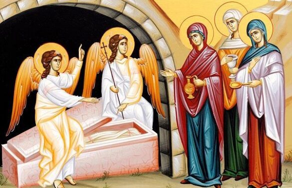 Οἱ μαθηταὶ εἶχαν κρυφτῆ ἀπὸ τὸ φόβο. Ἀλλὰ κάπου, σὲ μία γωνιά, κάποιοι ἄλλοι ἀγρυπνοῦν. Εἶνε μαθήτριες τοῦ Κυρίου. Αὐτές, ἀπὸ τὴ μεγάλη ἀγάπη ποὺ εἶχαν στὸν Κύριο, ἀψηφοῦν κάθε κίνδυνο καὶ φόβο, καὶ ἀποφασίζουν νὰ πᾶνε στὸ μνῆμα τοῦ Ἰησοῦ γιὰ νὰ μυρώσουν τὸ σῶμα του. Ποιές εἶνε αὐτές;